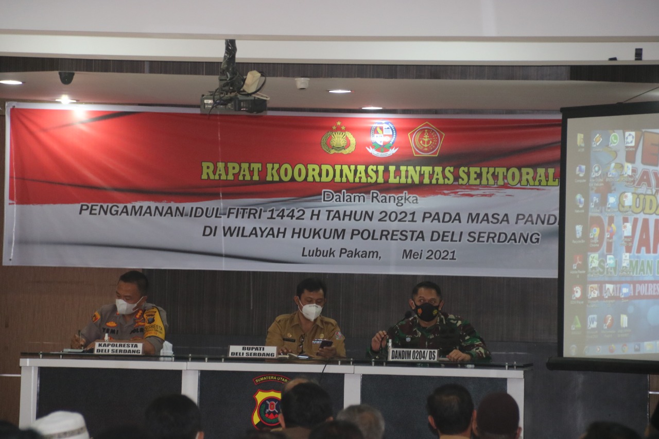 Kapolresta Deli Serdang Kombes Pol Yemi Mendagi, SIK, didampingi Dandim/0204 DS Letkol Kav Jackie Yudhantara dan Bupati Kabupaten Deli Serdang yang diwakili Asisten I Drs. Citra Efendi Capah, M.Sp. dalam sambutannya menyatakan, Rakor Lintas Sektoral ini dilaksanakan guna menindaklajuti Instruksi Presiden RI Ir. Joko Widodo Dalam Rangka Larangan Mudik pada Perayaan Hari Raya Idul Fitri 1442 H Tahun 2021 serta Pengamanan Idulfitri 1442 H Thn 2021 untuk memutus Mata Rantai Penyebaran Covid-19.