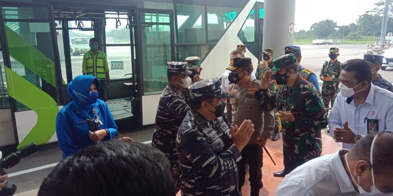 Pengamanan menyambut kedatangan Kasal Laksamana TNI Yudo Margono SE, MM, bersama Ibu dan rombongan di Bandara Internasional Kuala Namu Kabupaten Deli Serdang dilaksanakan Polresta Deli Serdang beserta TNI, pada Senin (30/8) .