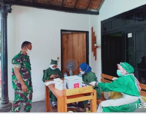 Babinsa Koramil Tipe B 0808/20 Sananwetan Kodim 0808/Blitar Sertu Eko Joko Santoso dengan penuh semangat selalu aktif mendampingi warga binaannya dalam mengikuti kegiatan serbuan vaksinasi Covid-19, diwilayahnya.