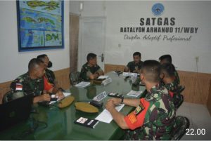 Pada kesempatan tersebut, Dirsen Pussenarhanud Kodiklatad, Brigjen TNI Dedi Solihin melakukan kunjungan ke Pos Kotis guna mengecek kondisi personel Satgas melalui Video Conference dengan para Danpos Satgas serta memberikan penekanan agar selalu waspada dan tanggap terhadap situasi dan kondisi di sekitar pos.