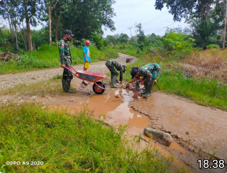 Letda Inf Moh Ridha Fitria Amd.kep, beserta tiga rekannya”, Sekarang musim hujan cukup tinggi mengakibatkan jalan desa banyak yang berlobang,jika tidak segera diperbaiki akan terjadi hal-hal yang tidak di inginkan”,maka dari itu kami bersama-sama warga perbaiki jalan desa ini”, harapannya warga bisa melintas dengan nyaman”, imbuhnya.