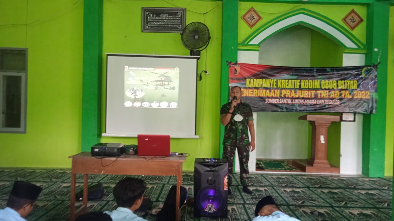 Kegiatan ini bertujuan untuk memberi gambaran tentang mekanisme penerimaan menjadi prajurit TNI AD, sekaligus untuk memberi motivasi bagi generasi muda dalam pengabdian kepada Negara dan Bangsa melalui TNI AD, yang bertempat di Aula MAN 3 Kunir Jl. Pondok Pesantren Al Kamal Dusun Cemandi Ds. Kunir Kec. Wonodadi Kab. Blitar, Rabu (12/1/2022).
