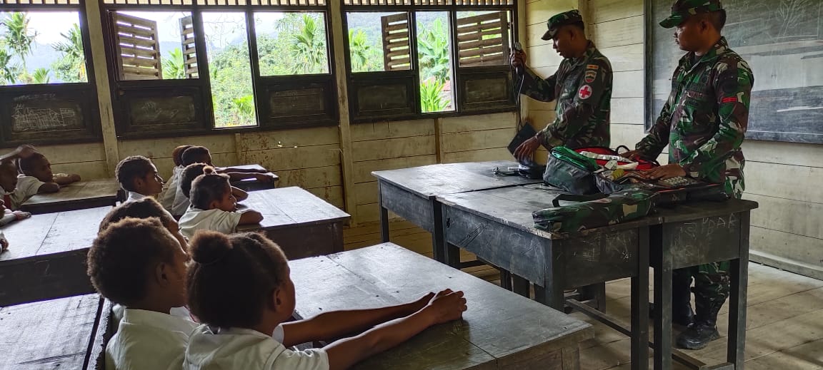 Satgas Pamtas RI-PNG Yonif 126/KC Pos Somografi memberikan pembekalan ilmu kesehatan kepada Siswa SD YPPK Akarinda Kampung Somografi, Distrik Web, Kabupaten Keerom.