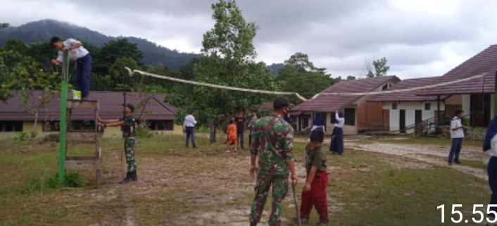 Guna meningkatkan minat olahraga sejak dini terutama di bidang olahraga bola voli, 5 personel pos Sungai Tengah Satgas Pamtas Yonif Mekanis 643/Wns dipimpin Praka Hasan bersama siswa-siswi melakukan karya bhakti membersihkan lapangan bola voli dan memberikan bantuan net voli kepada SMPN 06 Satap di Dusun Sungai Tengah, Desa Sebubus, Kec. Paloh, Kab. Sambas.