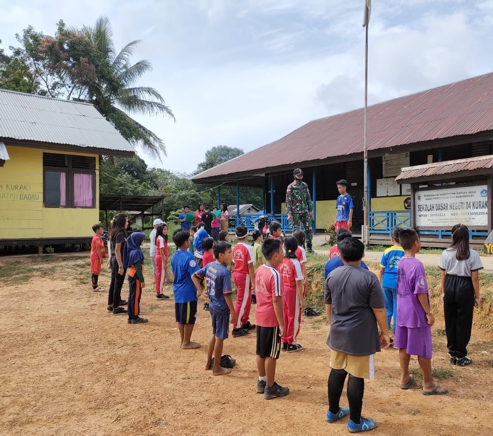 Anggota Satgas Pamtas RI-Malaysia Yonif 144/JY Ajarkan baris berbaris di SDN 04 desa Kekurak Kecamatan Badau Kabupaten Kapuas Hulu Kalbar.