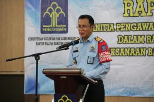 Kantor Wilayah Kementerian Hukum dan Hak Asasi Manusia Sumatera Utara melaksanakan Rapat Koordinasi Panitia Pengawas Daerah dengan PBH (Pemberi Bantuan Hukum) dalam rangka Penandatangan Kontrak Pelaksanaan Bantuan Hukum Tahun Anggaran 2022, yang bertempat di Aula Soepomo Kanwil Kemenkumham Sumut, Senin (21/02/22).