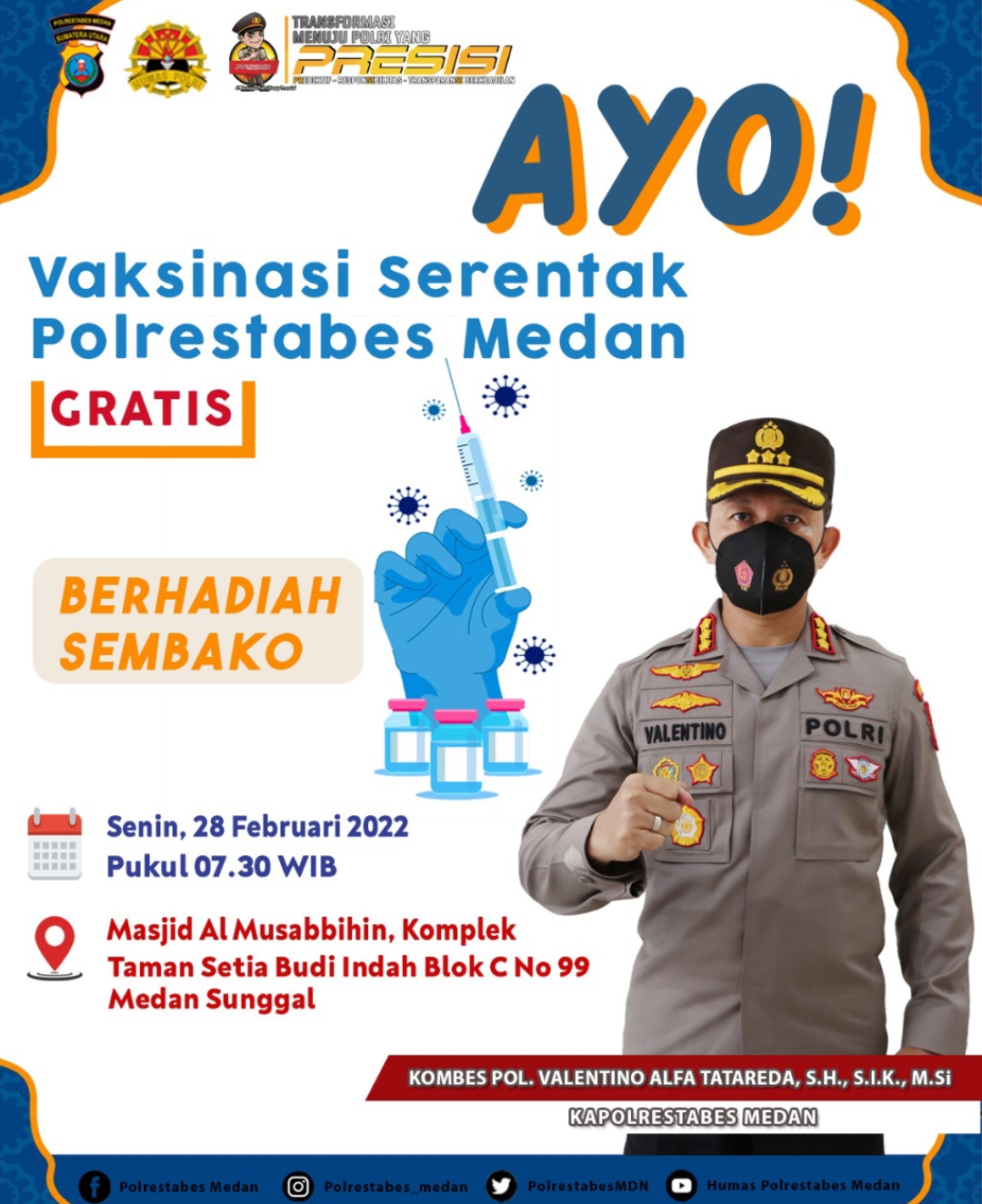 Medan – Transnusantara.co.id – Kapolrestabes Medan Kombes Pol Alfa Tatareda SH SIK M.Si, akan mengadakan Vaksinasi serentak yang dilaksanakan di Masjid Al-musabbihin Komplek Setiabudi Indah blok C No. 99 Medan Sunggal pelaksanaan pada Hari, Senin (28/02/2022), esok hari.