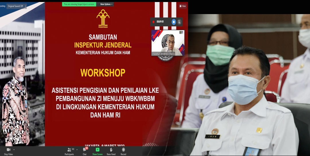 Sebagai upaya menyukseskan pelaksanaan Reformasi Birokrasi melalui Pembangunan Zona Integritas menuju Wilayah Bebas dari Korupsi (WBK)/ Wilayah Birokrasi Bersih dan Melayani (WBBM) hari ini, Kepala Kantor Wilayah Kementerian Hukum dan HAM Sumatera Utara, Imam Suyudi dan Kepala Divisi Pelayanan Hukum, Purwanto bersama Seluruh Pejabat Struktural dan Tim Kerja Pembangunan Zona Integritas mengikuti Workshop Sosialisasi Pengisian dan Penilaian LKE Pembangunan Zona Integritas menuju WBK/WBBM di lingkungan Kementerian Hukum dan HAM Tahun 2022 secara virtual dari Ruang Saharjo, Rabu (09/03/22).