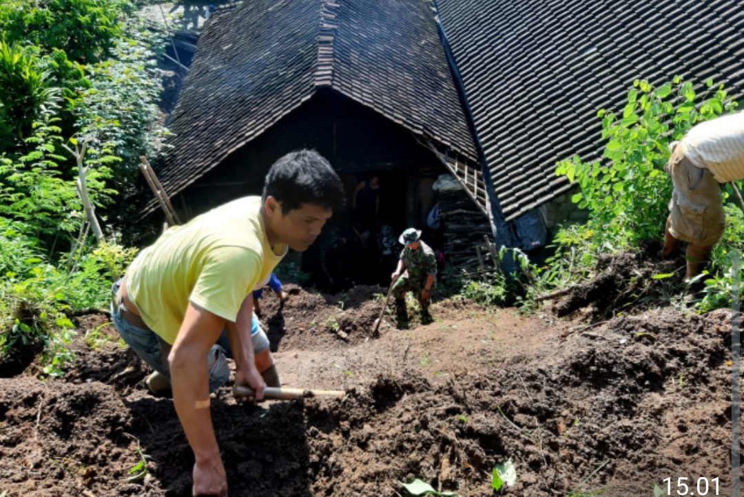 Berbekal cangkul dan alat seadanya, anggota Koramil Tipe B 0808/13 Doko bersama warga terus melaksanakan kegiatan pembersihan material tanah longsor yang menimpa bagian belakang rumah Bapak Tukiren hingga bersih.