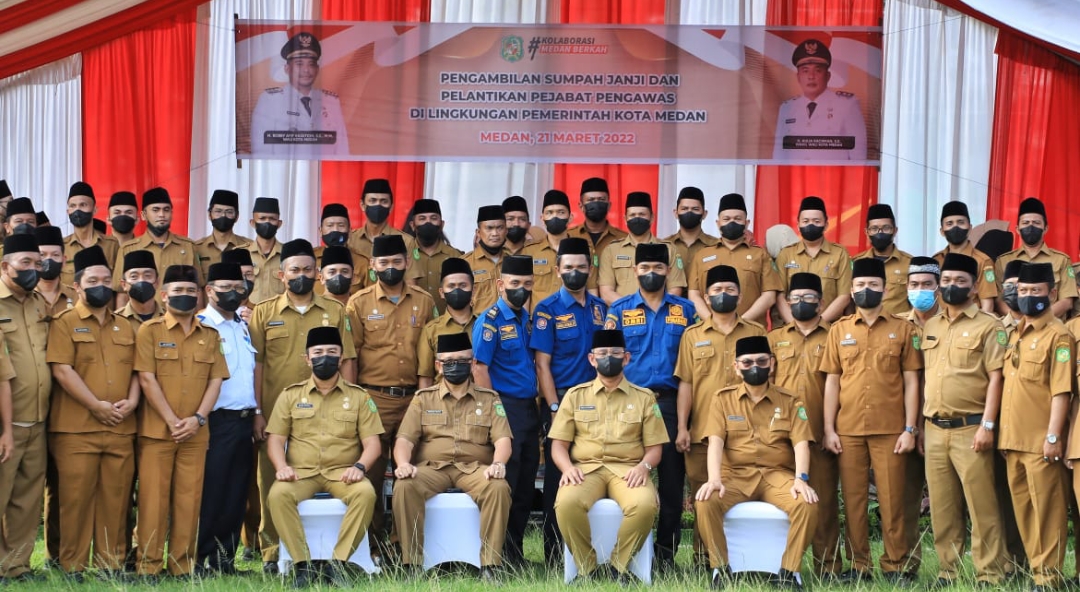 Wali Kota Medan Bobby Nasution diwakili Sekda Wiriya Alrahman melantik dan mengambil Sumpah Janji 221 Pejabat Pengawas di Lingkungan Pemko Medan, Senin (21/3) di Stadion Kebun Bunga. Diharapkan para pejabat yang dilantik ini dapat bekerja dengan rasa penuh tanggung jawab sesuai dengan ketentuan dan peraturan yang berlaku.