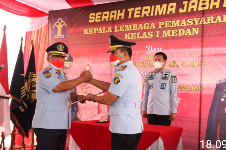 Kepala Lembaga Pemasyarakatan Kelas I Medan hari ini resmi berganti dari pejabat lama Erwedi Supriyatno ke pejabat baru Maju Amintas Siburian. Serah Terima Jabatan ini disaksikan langsung oleh Kepala Kantor Wilayah Kementerian Hukum dan HAM Sumatera Utara Imam Suyudi, yang bertempat di Lapas Kelas I, Medan (22/03/22).