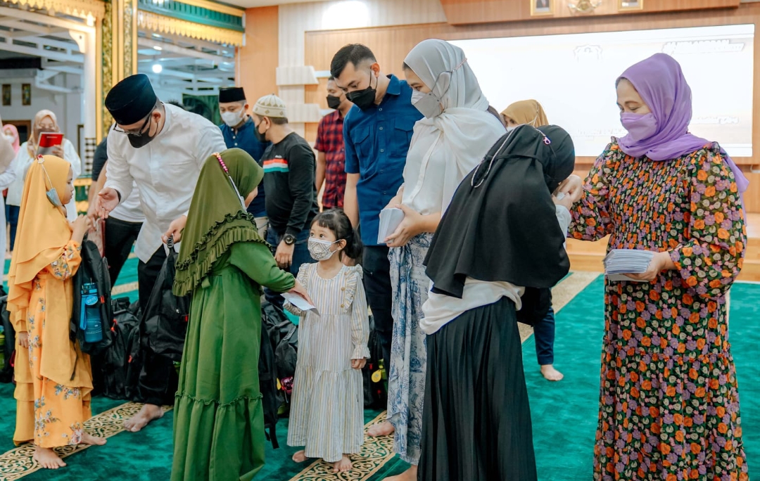 Di hari kedelapan Ramadhan 1443 H, Wali Kota Medan Bobby Nasution bersama Ketua TP PKK Kota Medan Ny Kahiyang Ayu M Bobby Afif Nasution memberikan santunan kepada puluhan anak yatim dari Panti Asuhan Al Jamiyatul Washliyah Pulo Brayan dan Kecamatan Medan Belawan di Pendopo Rumah Dinas Wali Kota Medan Jalan Sudirman Medan, Minggu (10/4).