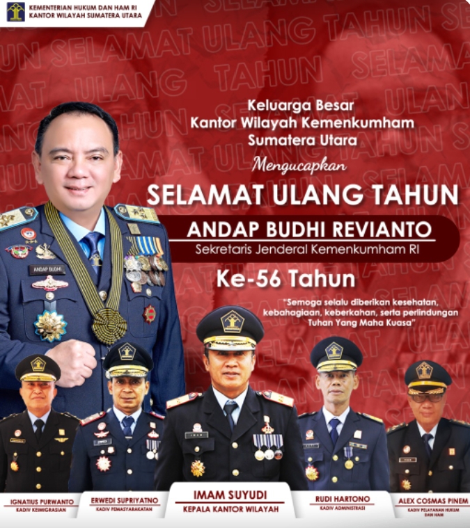 Seluruh jajaran Kantor Wilayah Kementerian Hukum dan HAM Sumatera Utara mengucapkan “Selamat Ulang Tahun Jenderal, Terus Berkarya dan Berinovasi, Panjang Umur Sehat dan Sukses Selalu.(Hisar LG).