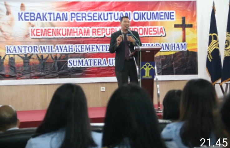 Medan – Trasnusantara.co.id – Sebagai sarana dalam pembinaan mental dan rohani bagi pegawai beragama nasrani di Lingkungan Kantor Wilayah Kementerian Hukum dan HAM Sumatera Utara, Pengurus Bina Mental Agama Kristen Kantor Wilayah Kementerian Hukum dan HAM Sumatera Utara menyelenggarakan Ibadah Rutin yang dilaksanakan di aula Soepomo lantai V kantor wilayah dan secara daring yang diikuti oleh seluruh pegawai yang beragama Kristen, Senin (27/06/22).