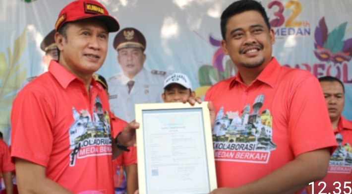 Dalam kesempatan ini, Kepala Kantor Wilayah Imam Suyudi menyerahkan pencatatan Hak Cipta yang diterima langsung oleh Walikota Medan Bobby Nasution.