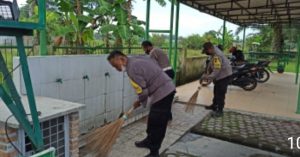 Anggota Polsek Batang Kuis bersih-bersih bersama Pengurus Mesjid, dengan Bergotong-royong sebagai Wujud Kebersamaan.