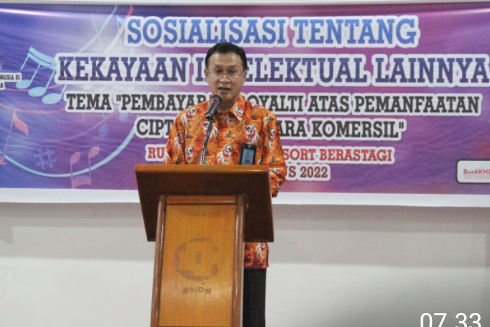 Brastagi – Transnusantara.co.id – Kepala Kantor Wilayah Kementerian Hukum dan Hak Asasi Manusia Sumatera Utara Imam Suyudi membuka secara resmi Kegiatan Sosialisasi Tentang Kekayaan Intelektual Lainnya Berkaitan Dengan Pembayaran Royalti Atas Pemanfaatan Cipta Lagu Secara Komersial, yang bertempat di Rudang Hotel & Resort Brastagi, Rabu (03/08/22).