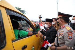 Kapolda Sumut Irjen Pol. Drs. RZ Panca Putra Simanjuntak, M.Si, bersama Gubernur Sumut Eddy Rahmayadi dan Pangdam I/BB Mayjen TNI A Chardin pun tak ketinggalan turun langsung membagikan bendera dan menempelkan sticker ke kendaraan milik masyarakat