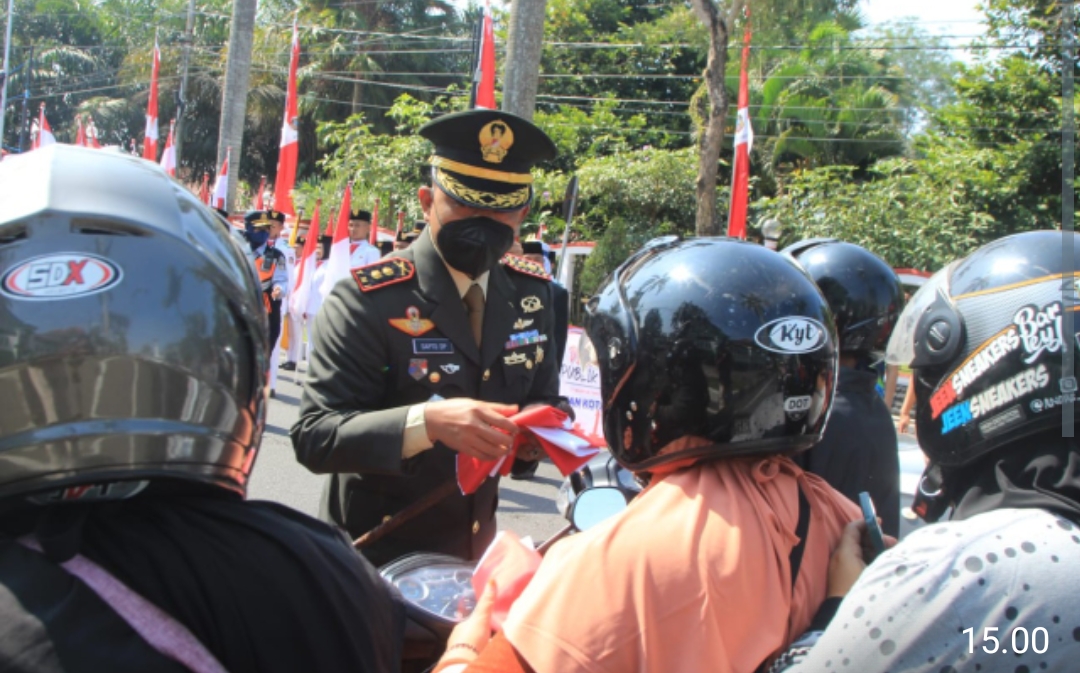 Blitar- Komandan Kodim 0808/Blitar Letkol Inf Sapto Dwi Priyono, S.E., membagikan bendera merah putih kepada para pengendara roda dua dan roda 4, yang melintas di Jl. Soedanco Soeprijadi Kota Blitar, Senin (15/8/2022).