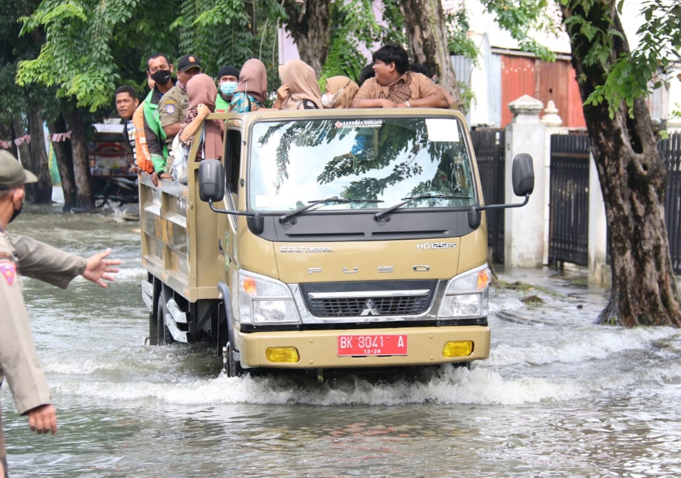Guna memperlancar evakuasi warga, armada milik Satpol PP Kota Medan juga turut disiagakan membantu.