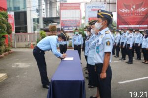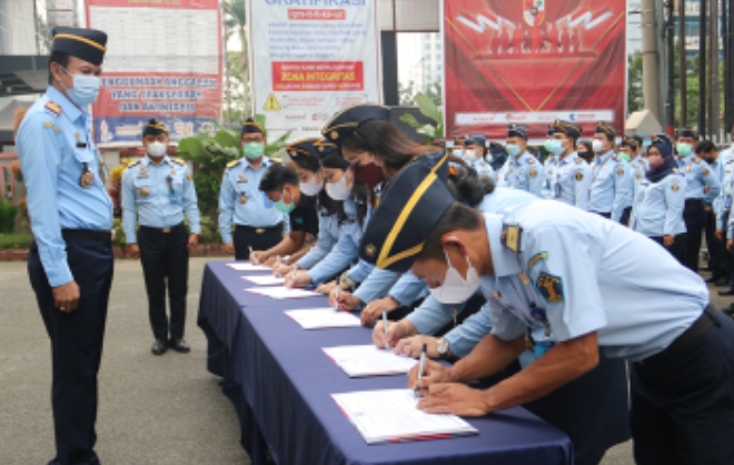Pelaksanaan Ikrar bersama dan penandatanganan Pakta Integritas dirangkaikan dengan pelaksanaan apel pagi kantor wilayah.