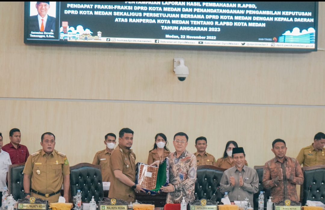 “Untuk mewujudkan sasaran dan target kinerja pembangunan kota dimaksud, tentunya salah satu instrument pokok yang sangat diperlukan adalah penetapan Perda APBD yang tepat waktu,” kata Wali Kota Medan Bobby Nasution dalam Paripurna Pendapat Fraksi-Fraksi DPRD Medan dan Pemandangan Umum Fraksi-Fraksi DPRD Medan Serta Penandatanganan/Pengambilan Keputusan DPRD Medan Dengan Kepala Daerah Atas Ranperda Kota Medan Tentang R.APBD Kota Medan Tahun Anggaran (TA) 2023 di Gedung DPRD Medan, Selasa (22/11).