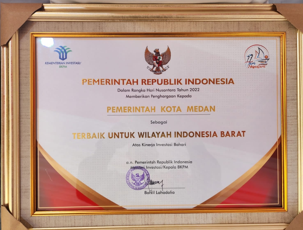 Pemko Medan dibawah kepemimpinan Wali Kota Medan Bobby Nasution kembali menerima penghargaan Nasional. Anugerah Penghargaan kali ini dari Kementerian Investasi/BKPM Republik Indonesia kepada Pemko Medan Atas Kinerja Investasi Bahari Terbaik untuk Wilayah Indonesia Barat Tahun 2022.