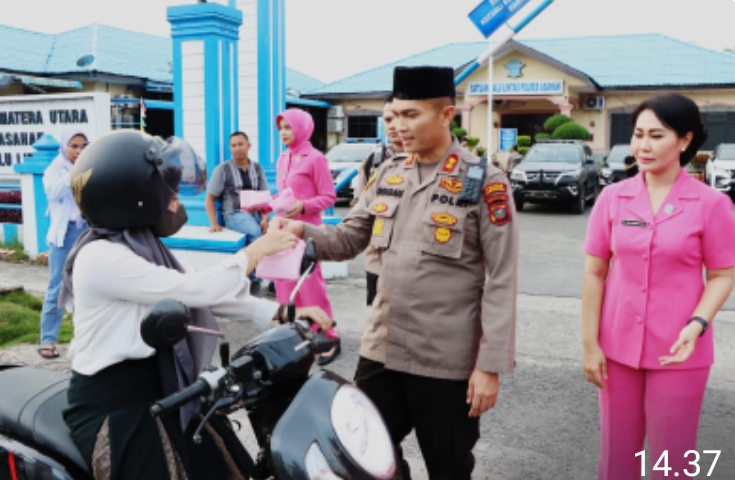 Kapolres Asahan dan Ketua Bhayangkari langsung turun kelokasi menyasar warga lewat dengan membagikan paket takjil di depan Kantor Satlantas Polres Asahan.