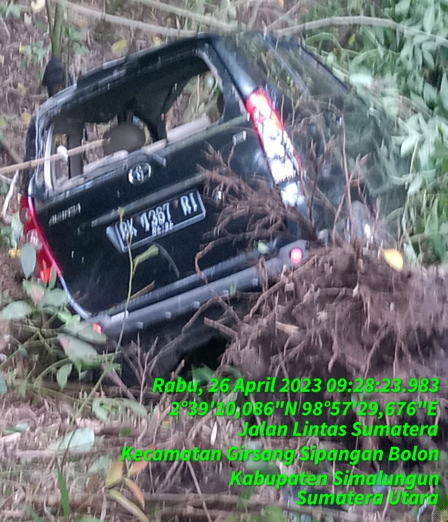 Transnusantara.co.id, Girsang, SIMALUNGUN–Rombongan dari Stabat Kabupaten Langkat Sumatera Utara, sebanyak 8 orang, yang ingin berwisata di Danau Toba dengan menggunakan mobil mini bus BK 1367, RI, yang dikemudikan oleh Agus Sumaidi mengalami musibah, mobil yang ditumpangi wisatawan tersebut masuk jurang sedalam sekitar 30 meter di Girsang II, sebelum jembatan Serasera Girsang Kelurahan Girsang, Kecamatan Girsang Sipangan Bolon Kabupaten Simalungun, pada Rabu ( 26/4/2023 ).