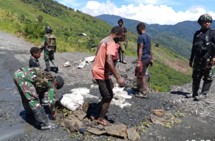 Puncak Jaya – Personil Pos Ramil Yambi Satgas Yonif RK 115/ML bersama dengan beberapa masyarakat Yambi, yaitu Sdr. Fitianut Talenggeng, Sdr. Walime Talenggeng, Sdr. Dison Talenggeng dan Sdr. Yos Talenggeng serta dibantu beberapa anak-anak antusias  melaksanakan gotong royong untuk memperbaiki jalan yang longsor menuju kampung Tinolok dan kampung Tirineri. Minggu (14/5/2023).