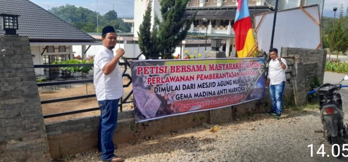 Spanduk Gema Madina Anti Narkoba bertuliskan: petisi bersama masyarakat Madina, perlawanan pemberantasan Narkoba dimulai dari Masjid Agung Nur Ala Nur Panyabungan Jumat 26 Mei 2023.