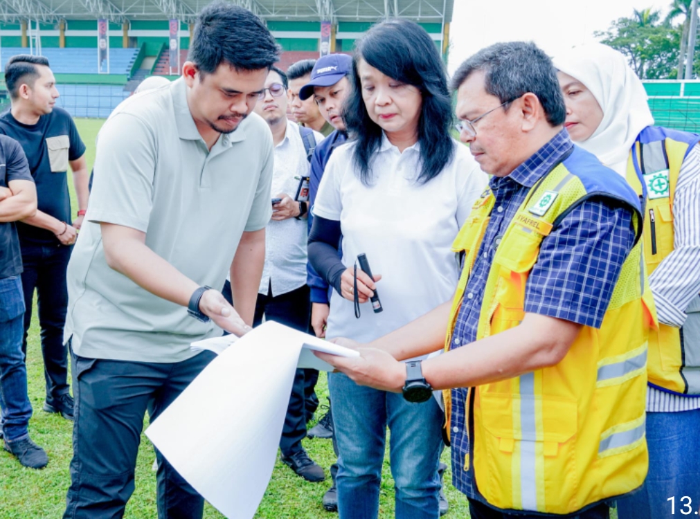 Transnusantara.co.id,Medan–Bersama Dirjen Cipta Karya Kementerian Pekerjaan Umum dan Perumahan Rakyat (PUPR) RI Diana Kusumastuti, Wali Kota Medan Bobby Nasution meninjau Stadion Teladan Medan, Minggu (11/6) pagi. Peninjauan lapangan yang dibangun tahun 1952 ini terkait rencana renovasi yang akan dilakukan di tahun ini (2023).