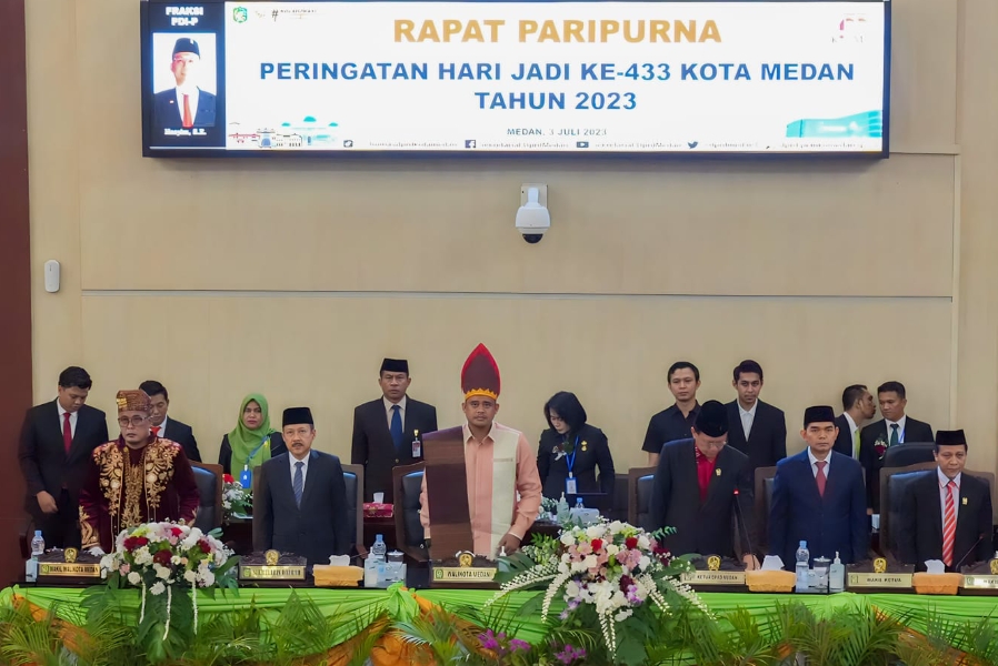 Demikian disampaikan Wali Kota Medan Bobby Nasution dalam Rapat Paripurna Istimewa DPRD Medan HUT ke-433 Kota Medan yang dipimpin Ketua DPRD Hasyim, Senin (3/7) di gedung dewan. Turut hadir dalam rapat tersebut antara lain Gubsu Edy Rahyamadi, para Konjen negara sahabat, unsur Forkopimda Medan, bupati/wali kota di Sumut, Wakil Wali Kota Medan H Aulia Rachman, Ketua TP PKK Medan, Kahiyang Ayu Bobby Nasution, Sekda Wiriya Alrahman, tokoh agama, tokoh masyarakat, dan seluruh pimpinan perangkat daerah di lingkungan Pemko Medan.