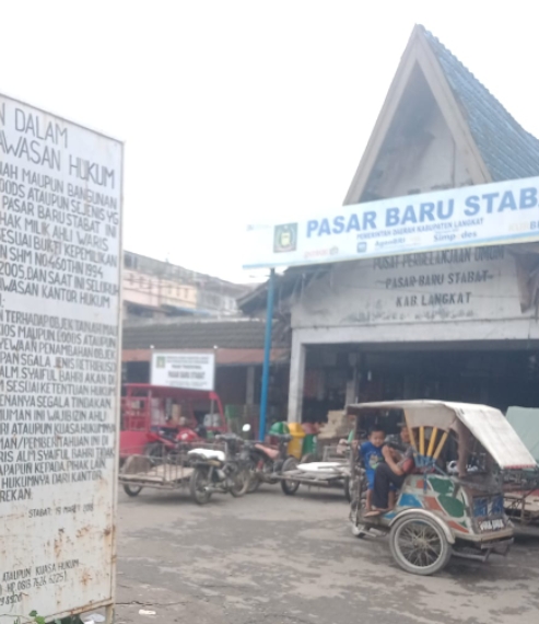 Terlihat plang di depan Pasar Baru Stabat, bertuliskan tentang pemberitahuan secara rinci ” dalam pengawasan hukum.”