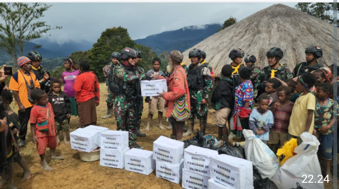 Puncak, Papua, Trans Nysantara – Satgas Mobile Raider 300 Siliwangi menyalurkan Bantuan Sosial dari Bapak Pangdam III/Siliwangi Mayjen TNI Kunto Arief Wibowo S.I.P kepada masyarakat di kampung Erogobog, Kab.Puncak Papua.