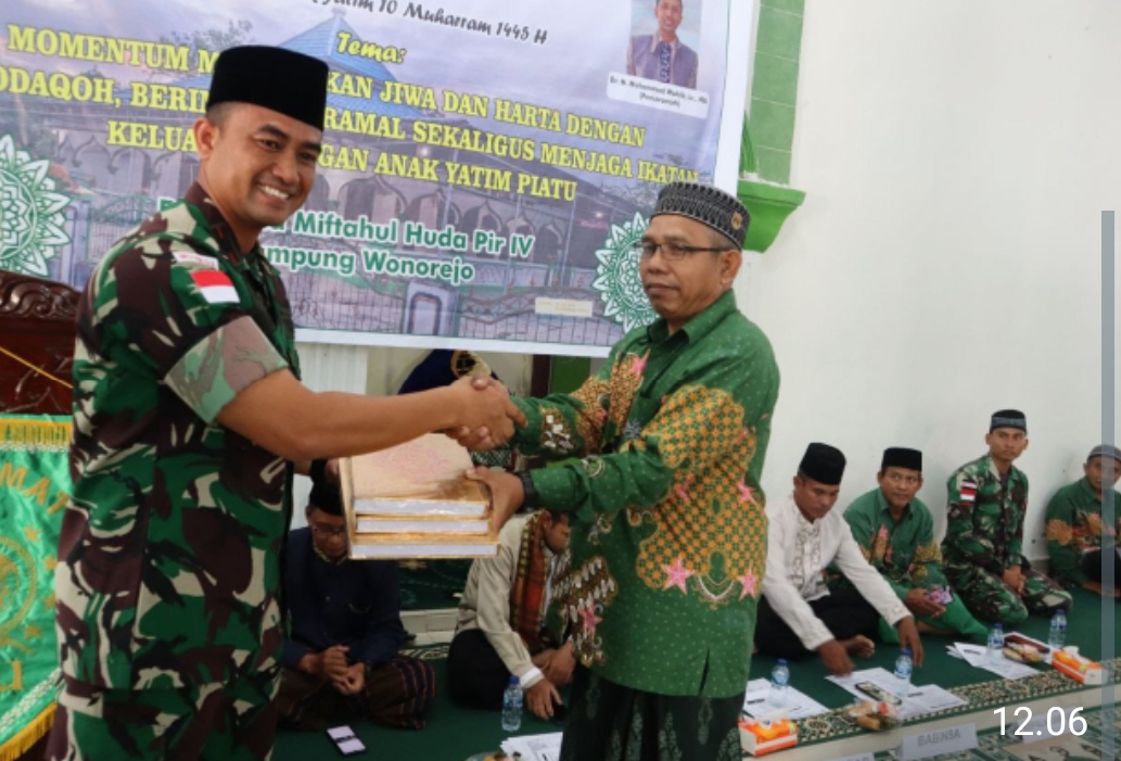 Keerom, Trans Nusantara– Dalam rangka mewujudkan kemanunggalan TNI dengan rakyat, Dansatgas Yonif 122/TS Mayor Inf Diki Apriyadi menghadiri kegiatan pengajian Muslimat Nahdlatul Ulama (NU) Cabang kabupaten Keerom dan pemberian santunan kepada anak-anak Yatim-piatu, dalam rangka memperingati tahun baru Islam 1 Muharam 1445 H, bertemakan “momentum mensucikan jiwa dan harta, dengan bersodakoh, berinfak,beramal sekaligus menjaga ikatan keluarga dengan anak yatim piatu/duafa”.,Bertempat Masjid Miftaful Huta, Kampung Wonerejo,Pir IV Arso Distrik Mannem, Kabupaten Keerom Papua, Senin (31/07/2023).
