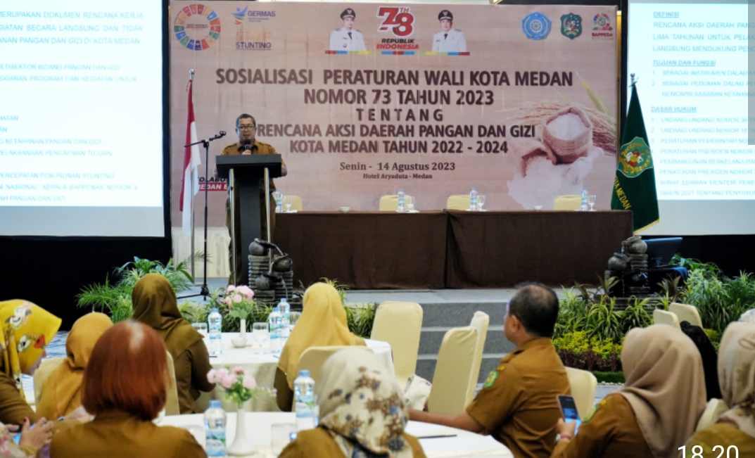 Data tersebut disampaikan oleh Kepala Badan Perencanaan Pembangunan Daerah (Bappeda) Kota Medan Benny Iskandar ketika mewakili Wali Kota Medan Bobby Nasution saat membuka acara Sosialisasi Peraturan Wali Kota Medan No 73 Tahun 2023 Tentang Rencana Aksi Daerah Pangan dan Gizi (RAD-PG) tahun 2022-2024 di Hotel Arya Duta Medan, Senin (14/8).