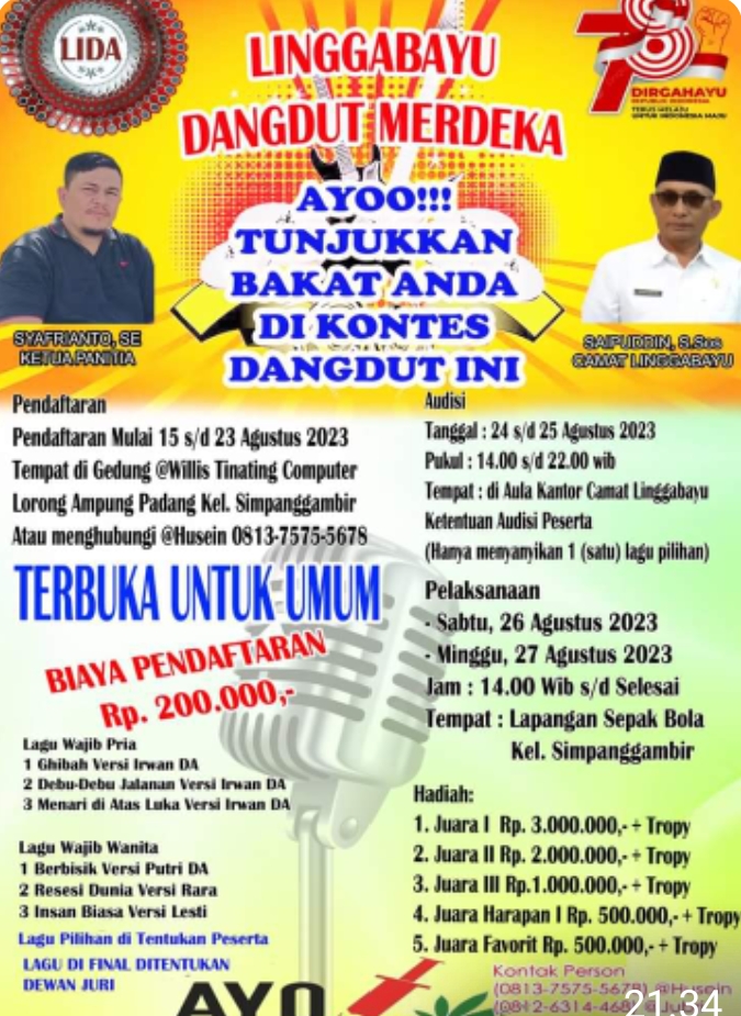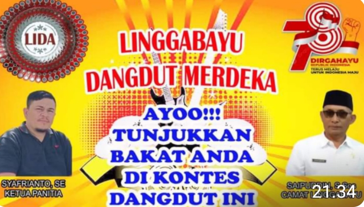 Sebelum membuka kontes Lingga Bayu Dangdut Merdeka, LIDA, Camat Lingga Bayu Saipuddin S. Sos menyatakan, bahwa acara ini terselenggara atas semangat para pedagang dan masyarakat Kelurahan Simpang Gambir Kecamatan Lingga Bayu dalam memeriahkan perayaan HUT RI ke 78 tahun 2023. Sehingga acara Kontes Lingga Bayu Dangdut Merdeka (LIDA) tersebut dapat terlaksana dengan baik.