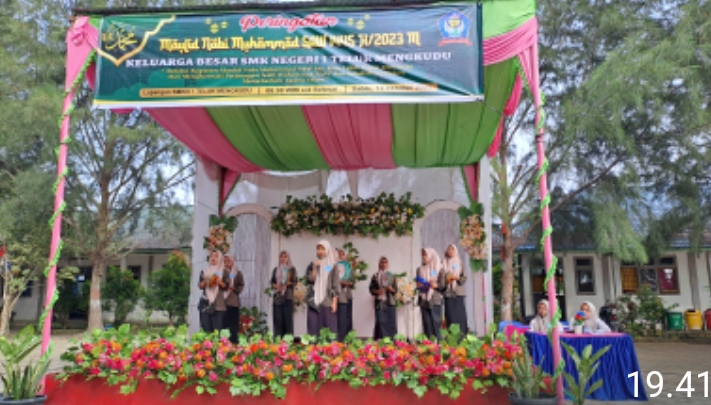 Acara kegiatan Maulid Nabi Muhammad SAW 1445 berlangsung di laksanakan bersama seluruh ungdangan di lapangan hijau SMKN 1 Teluk Mengkudu