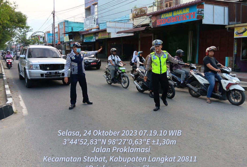 Trans Nusantara.co.id, LANGKAT – Sat Lantas Polres Langkat melaksanakan Pos padat pagi dan pengaturan arus lalulintas di setiap persimpangan di kota Stabat Kecamatan Stabat Kabupaten Langkat, Selasa, ( 24/10/2023 ).
