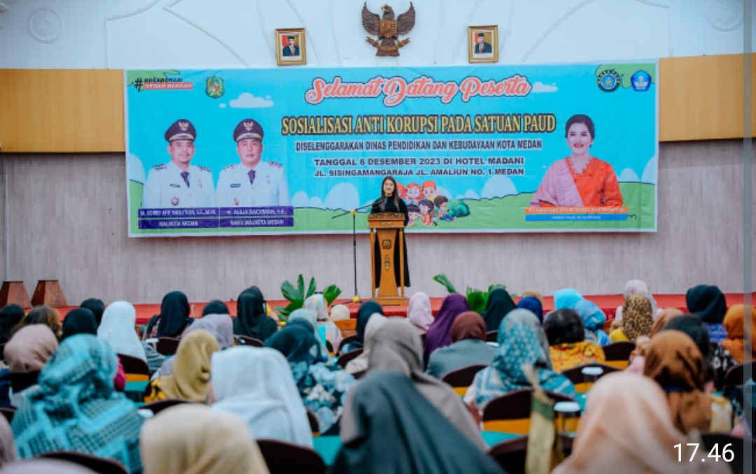 Medan, Trans Nusantara–                    Dalam rangka memperingati Hari Antikorupsi Sedunia 2023, Pemko Medan melalui Dinas Pendidikan dan Kebudayaan Kota Medan menggelar Sosialisasi Antikorupsi pada Satuan PAUD tahun 2023 di Hotel Madani Medan, Rabu (6/12). Bunda PAUD Kota Medan Ny Kahiyang Ayu M Bobby Afif Nasution berharap, sosialisasi ini dapat membangun dan menanamkan karakter jujur, peduli, mandiri, disiplin dan bertanggung jawab.