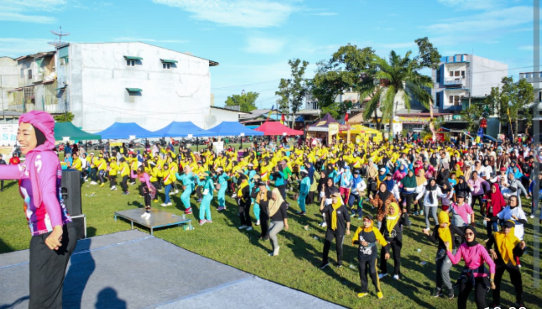 Medan, Trans Nusantara–Ribuan masyarakat khususnya yang tinggal di Kecamatan Medan Marelan dan sekitarnya mengikuti Jalan santai dan Senam Kolaborasi bersama Wali Kota Medan Bobby Nasution di lapangan bola Pasar 5 Kelurahan Rengas Pulau, Sabtu (16/12/2023). Kegiatan ini bertujuan untuk meningkatkan kecintaan masyarakat terhadap olahraga sekaligus meningkatkan kebersamaan dan harmonisasi antara Pemko Medan dengan masyarakat.