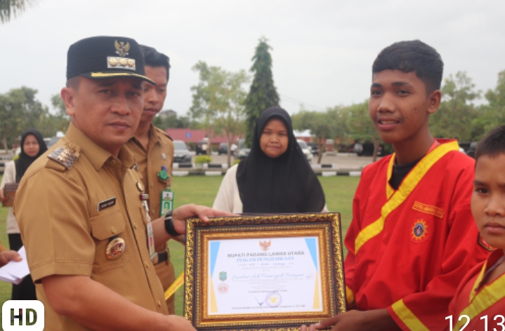 PALUTA,Trans Nusantara.co.id-Pj Bupati Padang Lawas Utara Patuan Rahmat Syukur P Hasibuan,S.STP.,MM.,didampingi PIh Sekretaris Daerah Makmur Harahap,ST.,MM.,Para Asisten,dan Pimpinan OPD menyerahkan piagam penghargaan kepada 13 orang putra terbaik Kabupaten Padang Lawas Utara yang mengharumkan Kabupaten Padang Lawas Utara di bidang Pencak Silat,Senin (29/01/2024).