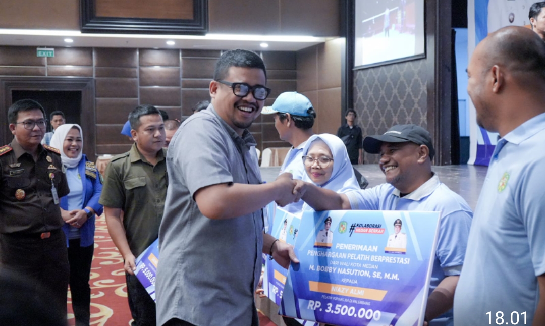 Medan, Trans Nusantara–Wali Kota Medan Bobby Nasution menyerahkan penghargaan kepada 157 atlet, 35 pelatih, dan 19 asisten pelatih berprestasi tingkat provinsi, nasional, maupun internasional, Selasa (6/2) di Hotel Four Point.