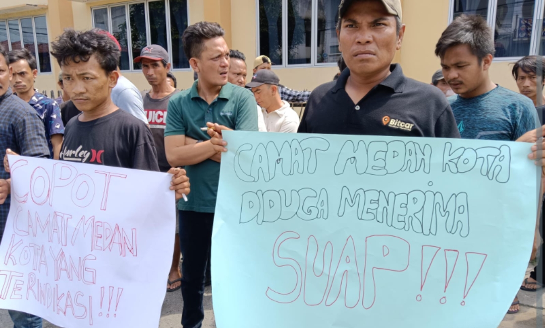 Para pendemo disambut oleh Sekcam Medan Kota, dan Kasi Trantib Kecamatan dan Kelurahan, setelah berorasi selama sekitar 30 menit di depan kantor Camat Medan Kota.