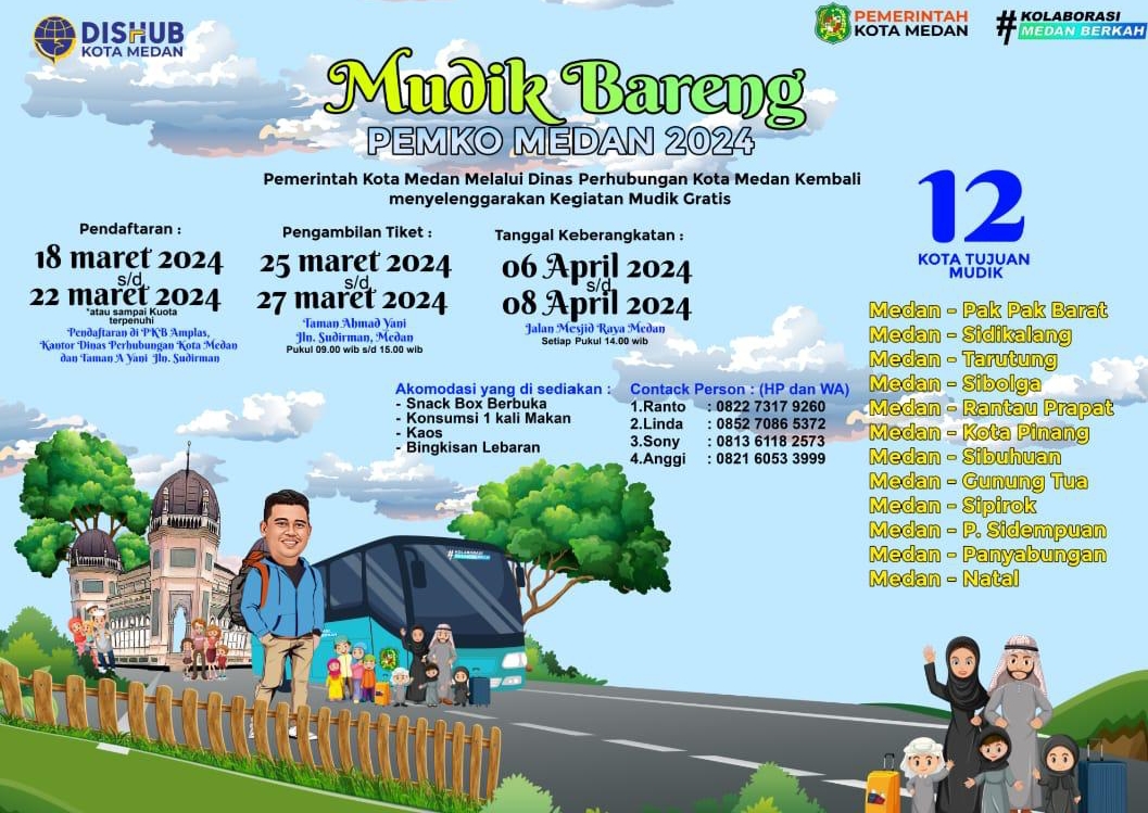 “Para calon pemudik akan diberangkatkan pada tanggal 6 hingga 8 April 2024 sekitar pukul 14.00 WIB di Jalan Masjid Raya, Medan. Keberangkatan ini akan dilepas langsung bapak Wali Kota Medan Bobby Nasution. Calon pemudik dipersilahkan memilih tanggal keberangkatan sesuai yang ditetapkan”, sebutnya.
