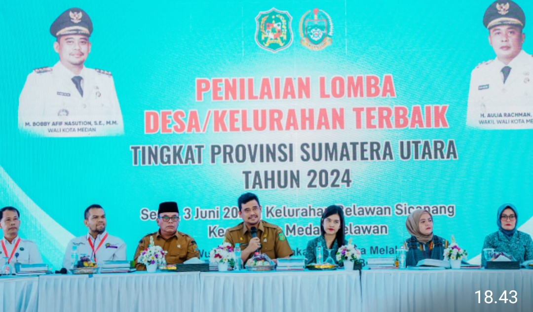 Medan, Transnusantara–                        Wali Kota Medan Bobby Nasution didampingi Ketua TP PKK Kota Medan Kahiyang Ayu menerima Tim Penilai Lomba Desa/Kelurahan Tingkat Provinsi Sumatera Utara di Kelurahan Belawan Sicanang, Kecamatan Medan Belawan, Senin (3/6).  Penilaian dilakukan untuk melihat aktivitas inovasi pelayanan yang dilakukan. Diharapkan, kehadiran tim penilai semakin memotivasi Kelurahan Belawan Sicanang untuk memberikan pelayanan terbaik kepada masyarakat.