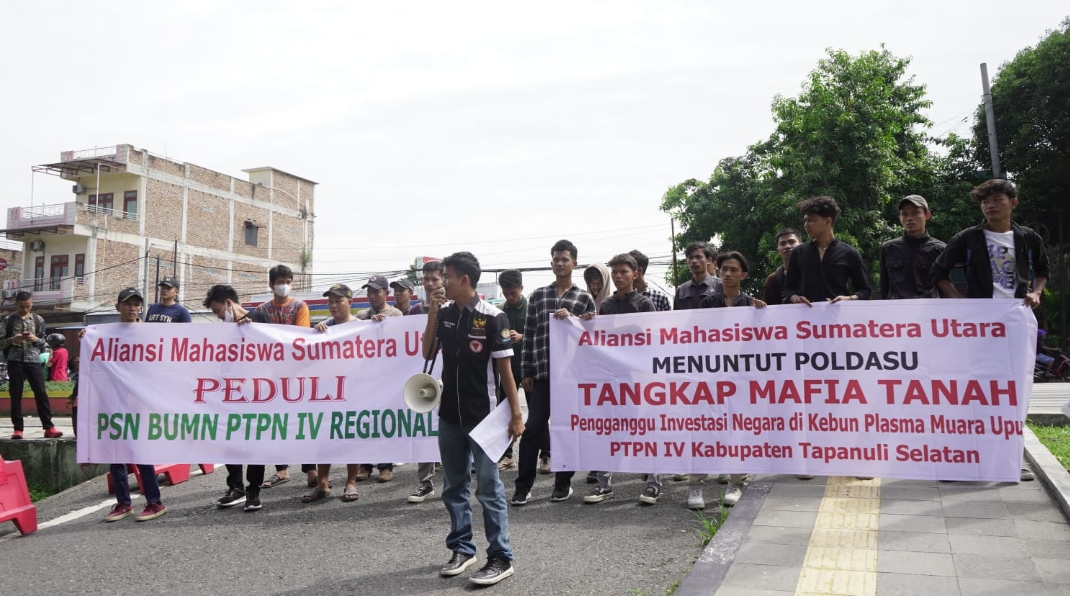 Medan, Transnusantara.co.id. Aksi Mahasiswa Sumatera Utara di depan Mapolda Sumatera Utara Jl. Sisingamangaraja Km. 10,5 Kota Medan, baru-baru ini, untuk memberi dukungan kepada Aparat Penegak Hukum khususnya Polda Sumatera Utara agar segera mengambil tindakan tegas terhadap oknum Pengurus KPSS Muara Upu Tapsel yang memblokade pengangkutan produksi Afdeling VII Kebun Batang Toru PTPN IV Regional I.