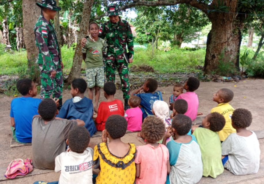 Mappi,Transnusantara –Prajurit Satgas Yonif 125/Si’mbisa Pos Bade memberikan pengetahuan wawasan kebangsaan kepada anak-anak di wilayah Distrik Edera, Kabupaten Mappi, Papua Selatan, melalui kegiatan belajar mengajar di bawah pohon pada Senin (08/07/2024).