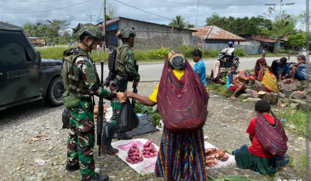 Kiribun Yahukimo, Transnusantara–PenKoopsTNI, The Task Forces of the Infantry Battalion 6 Marines, part of the Indonesian Armed Forces Operational Command (KOOPS TNI) in Papua, is currently carrying out mobile security at the border of Indonesia and Papua New Guinea, especially in the Yahukimo Regency area, Papua Pegunungan Province. On Friday, 12 July 2024, the Marines Task Forces Patrol Team conducted routine security patrols in the Kiribun Village, Dekai District, Yahukimo Regency. During the patrol, the Soldiers had the opportunity to cross the Kiribun Market and carry out the “ROSITA” (Buy up Farming Products) belonging to residents who sold their farming products in the market.